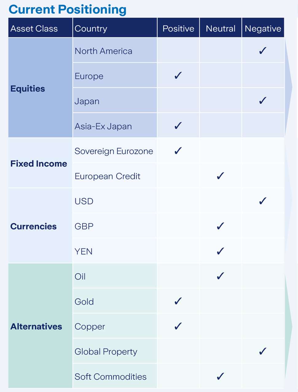 Our current position is modestly overweight equities and reasonably neutral bonds. At the end of January, we added to equities and added to the existing overweight in Gold.